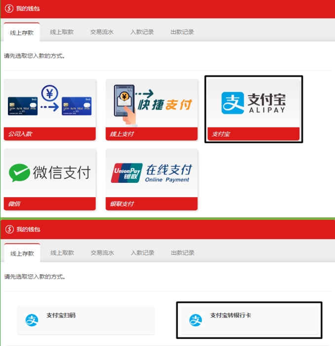 电脑用户点击右上角登入,登入会员账号,点击线上存款。再点击支付宝,选择支付宝转银行卡