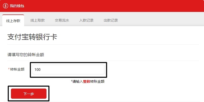 输入您要转账的金额(必须为整数),再点击下一步。