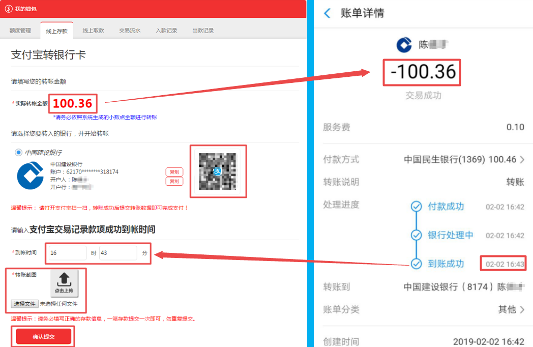 打开支付宝扫一扫,扫描入款页面中的二维码进行转账(此二维码只能使用一次,请勿重复使用并且转账金额务必与系统生成的小数点金额一致);到账成功后按照提示填写到账时间,并上传您的转账详情截图,在点击确认提交。(温馨提示:务必先确认到账后,填写准确到账时间,再点击提交,否则财务人员查询不到款项无法第一时间帮您添加额度。)
